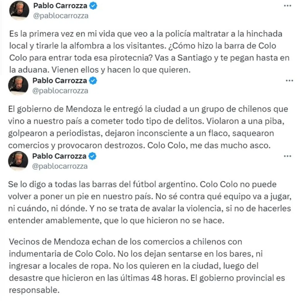 Y para cerrar, Carrozza detalló que “vecinos de Mendoza echan de los comercios a chilenos con indumentaria de Colo Colo. No los dejan sentarse en los bares, ni ingresar a locales de ropa. No los quieren en la ciudad, luego del desastre que hicieron en las últimas 48 horas. El gobierno provincial es responsable”.