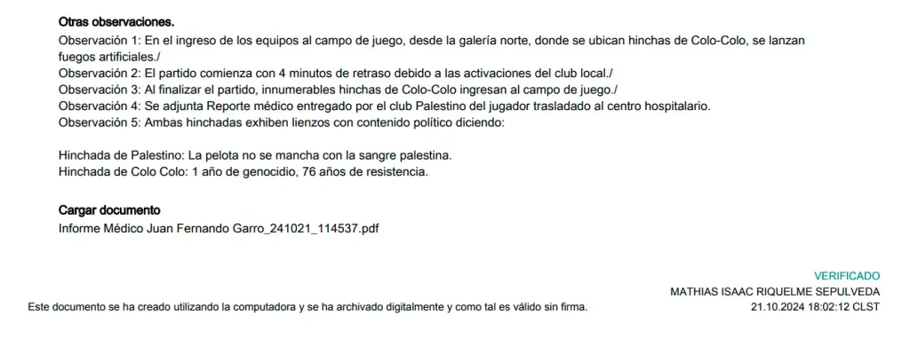 En el primero de los puntos que se expone en la sección Observaciones, se indica que “en el ingreso de los equipos al campo de juego, desde la galería norte, donde se ubican hinchas de Colo Colo, se lanzan fuegos artificiales“.