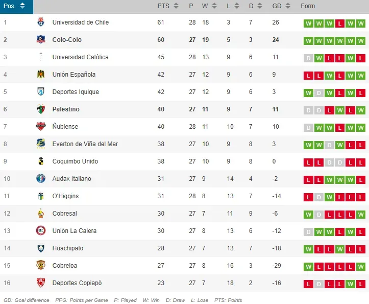 Así marcha Colo Colo en la tabla de posiciones previo al duelo con Palestino: