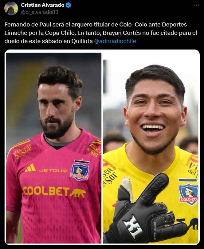 Así lo informó el periodista de Radio ADN, Cristian Alvarado, quien reportea a diario la actualidad del Cacique: “Fernando de Paul será el arquero titular de Colo Colo ante Deportes Limache por la Copa Chile. En tanto, Brayan Cortés no fue citado para el duelo de este sábado en Quillota“, sostuvo Tomate.