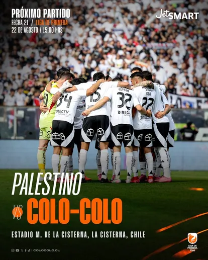 Colo Colo vs. Palestino juegan este viernes 22 de agosto, desde las 15:00 hrs. en el Estadio Municipal de La Cisterna, por la Fecha 21 del Campeonato Nacional.