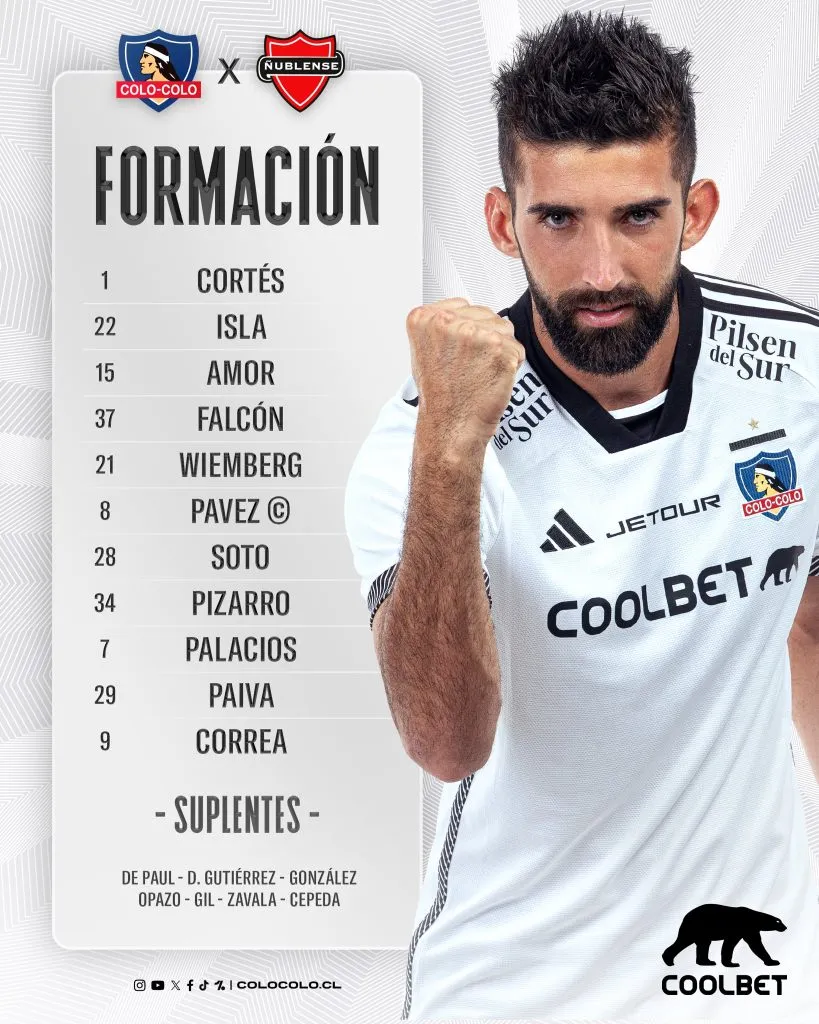 Para el duelo, Almirón ya confirmó la formación de Colo Colo con Brayan Cortés en el arco; Mauricio Isla, Emiliano Amor, Maximiliano Falcón y Érick Wiemberg en defensa; Esteban Pavez, Lucas Soto, Damián Pizarro; y Carlos Palacios en mediocampo; Guillermo Paiva y Javier Correa en el ataque.
