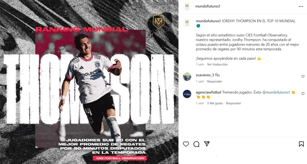 “Nuestro representado ha conquistado el octavo puesto entre jugadores menores de 20 años con el mejor promedio de regates por 90 minutos esta temporada. ¡Seguimos apoyándote en cada paso!”, rezaba la publicación. Un gran punto en común entre el Huesi y Thompson, que ahora deberá reenfocarse para el Superclásico ante la aproblemada Universidad de Chile.