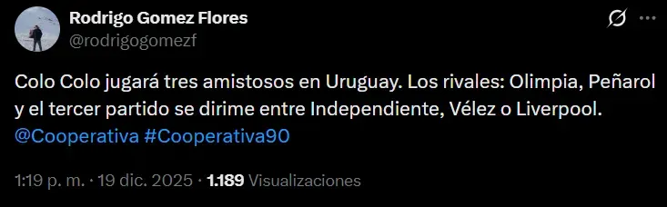 De acuerdo a la información entregada por el comunicador a través de su cuenta de X, los albos jugarán ante Olimpia de Paraguay, Peñarol de Uruguay y un tercer rival aún por definir, que saldría entre Independiente de Avellaneda dirigido por un viejo conocido Gustavo Quinteros, Vélez Sarsfield o Liverpool de Uruguay.