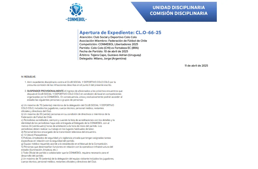 El segundo inciso señala que “suspende provisionalmente el ingreso de aficionados a los próximos encuentros que dispute Colo Colo en esta Copa Libertadores“, y se detalla las únicas personas que podrán ingresar desde ahora al Estadio Monumental.