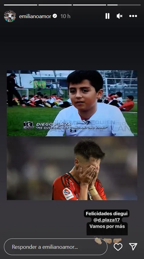 Emiliano Amor fue otro que felicitó a Diego Plaza. El zaguero central argentino, eso sí, aludió a una imagen que se viralizó tras el gol del volante. Una de hace mucho tiempo, en la que reconocía que su objetivo es “ser como Arturo Vidal”. Qué cosas tiene el destino, anotó su primer gol justo antes de que Colo Colo anunciara formalmente el retorno del Rey.