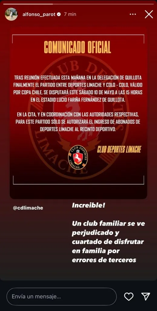Así las cosas, la decisión de un ridículo aforo para este partido entre Deportes Limache y Colo Colo no dejó indiferente a nadie. De hecho, un jugador que es figura en el cuadro tomatero reaccionó a la medida tomada por la autoridad.
