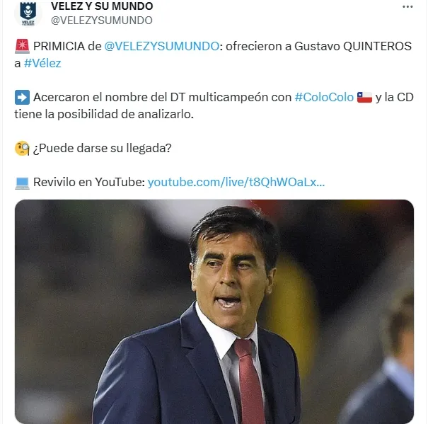 Esa misma tarde, el programa “Vélez y su mundo”, confirmó el acercamiento del ex técnico de Colo Colo, además que sumaron a ese ofrecimiento el de Martín Palermo.