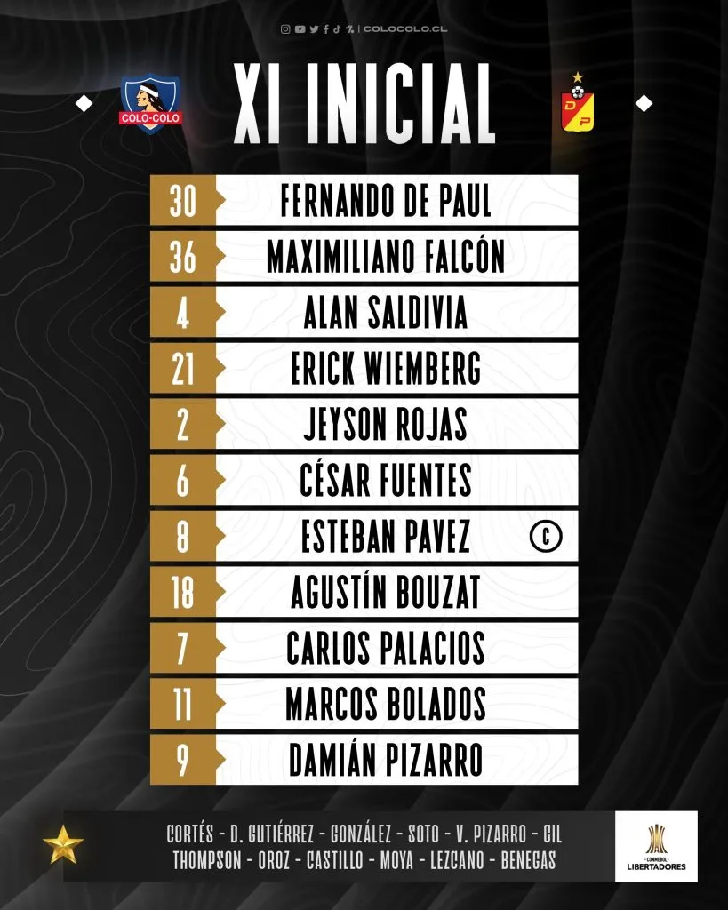 Para el crucial partido, Gustavo Quinteros confirmó la formación del Cacique con Fernando De Paul en el arco; Maximiliano Falcón, Alan Saldivia y Erick Wiemberg en defensa; Jeyson Rojas, Esteban Pavez, César Fuentes, Agustín Bouzat; y Carlos Palacios en la zona de volantes; Marcos Bolados y Damián Pizarro en ataque.