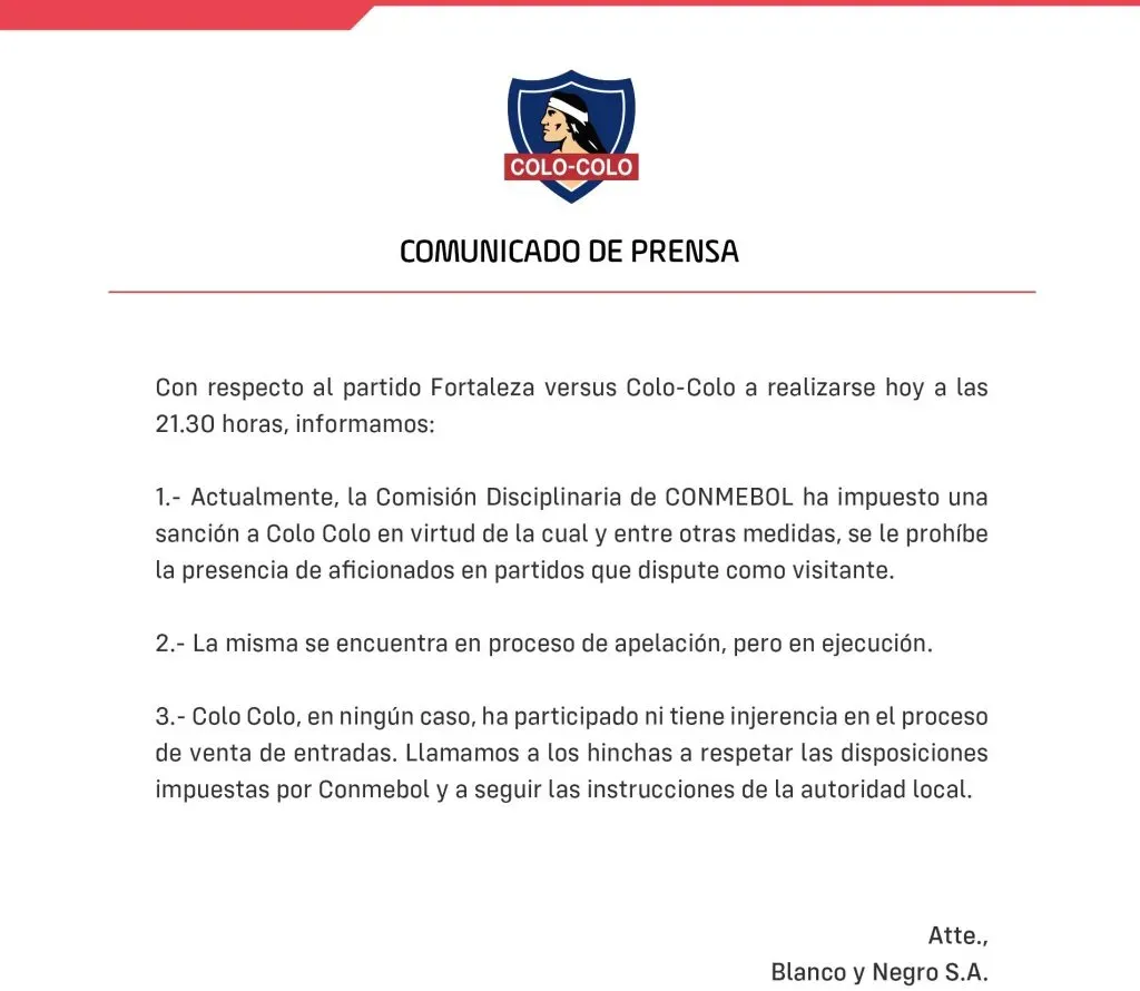 A través de un comunicado, el club albo informó acerca de la medida que los afecta tanto a los encuentros de local como los de visita. “Actualmente, la Comisión Disciplinaria de CONMEBOL ha impuesto una sanción a Colo Colo en virtud de la cual, y entre otras medidas, se le prohíbe la presencia de aficionados en partidos que dispute como visitante“, señalaron.