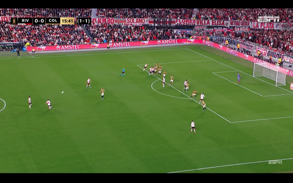 Marcos Acuña lanzó un centro bombeado al área de Colo Colo, tras una falta que le cobraron a Erick Wiemberg. El balón iba rumbo a Germán Pezzella, pero fue interceptado por Emiliano Amor.