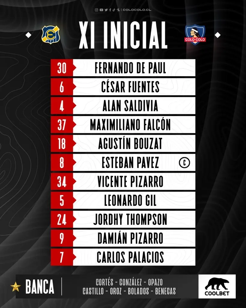 Los albos van de inicio con Fernando de Paul al arco; César Fuentes, Alan Saldivia, Maximiliano Falcón y Agustin Bouzat en defensa; Vicente Pizarro, Esteban Pavez y Leonardo Gil en mediocampo; Carlos Palacios, Jordhy Thompson y Damián Pizarro en el ataque.