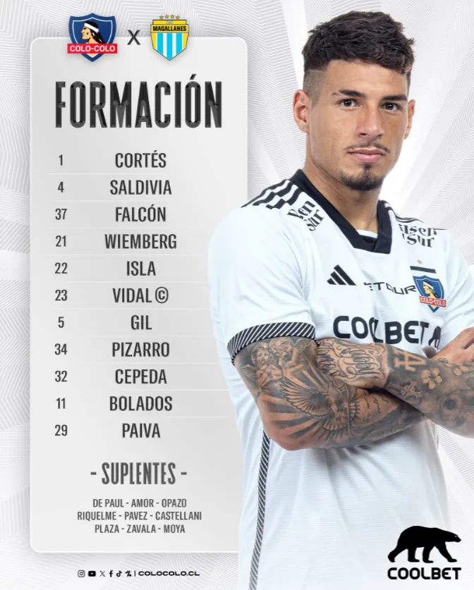 Así las cosas, Almirón dispondrá a Brayan Cortés en la portería; Mauricio Isla, Alan Saldivia, Maximiliano Falcón y Erick Wiemberg en la defensa; Vicente Pizarro, Leonardo Gil y Arturo Vidal en el mediocampo; Marcos Bolados, Lucas Cepeda y Guillermo Paiva en el dúo ofensivo.