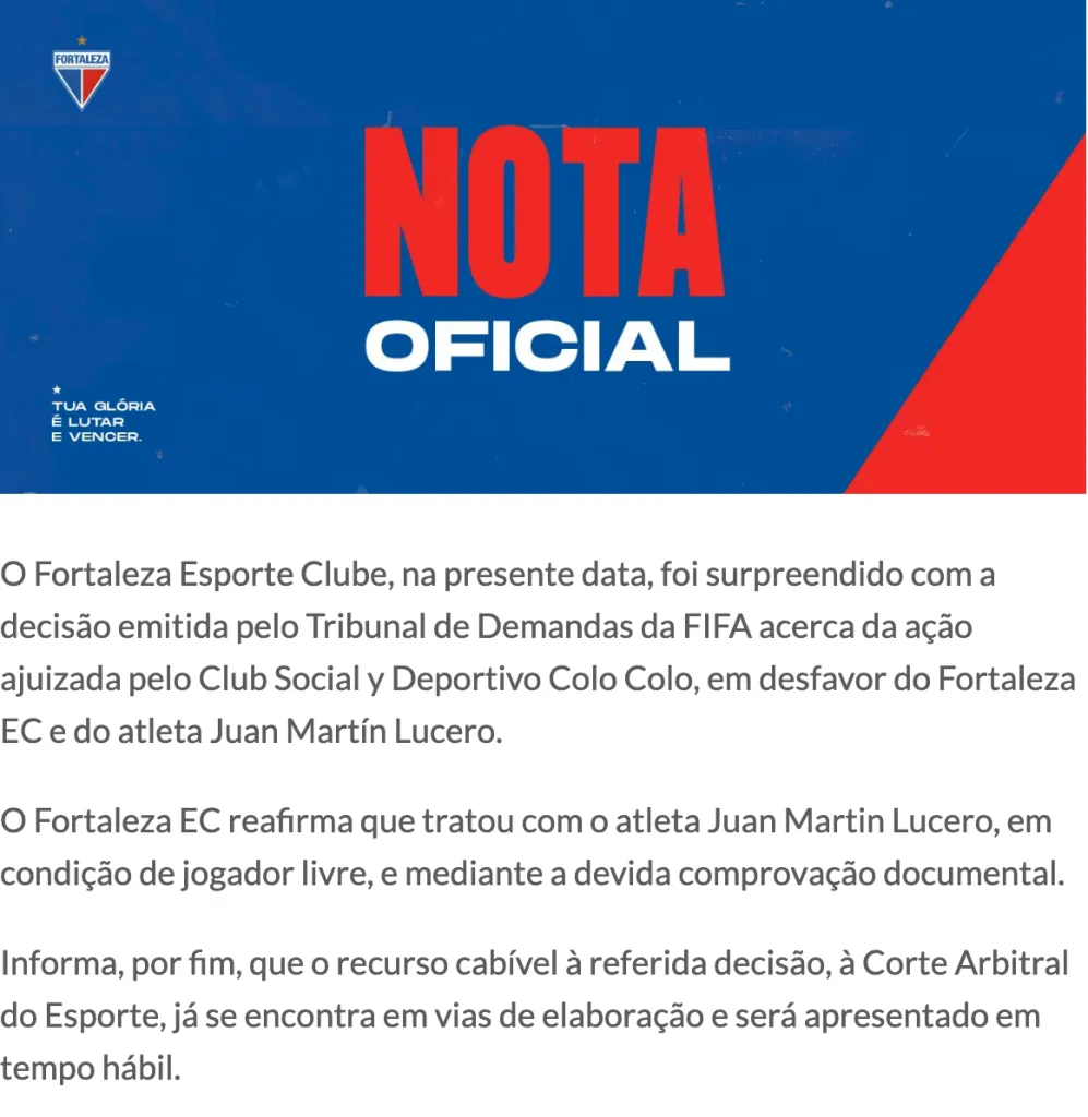 “Fortaleza Esporte Clube, en esta fecha, fue sorprendido por la decisión emitida por la Corte de Reclamaciones de la FIFA sobre la demanda presentada por el Club Social y Deportivo Colo Colo, en perjuicio de Fortaleza EC y del atleta Juan Martín Lucero”, comenzó el documento.