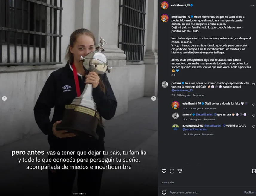 La jugadora, hoy de 35 años y figura del elenco hispano, utilizó en los últimos días su cuenta de Instagram para compartir un resumen de su carrera, acompañado de una potente reflexión y diversas fotografías. En una de ellas aparece su etapa en Colo Colo tras conquistar la Copa Libertadores Femenina, afuera del Palacio de La Moneda.