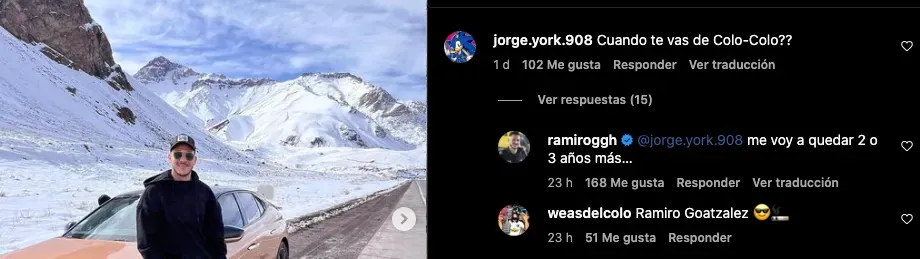 Pero fue en una publicación de Instagram donde Ramiro González dejó claro realmente lo que espera de este mercado de pase. Al costado de una foto en la Cordillera, un usuario le preguntó que cuándo se iba de Colo Colo.