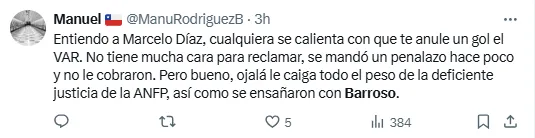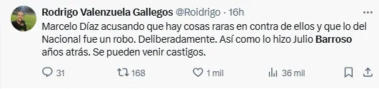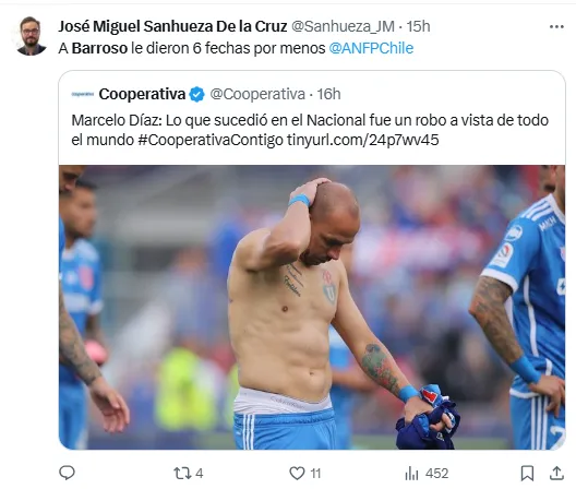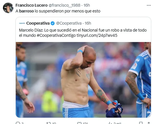 “La ANFP y quienes tengan que tomar cartas en el asunto las tendrán que tomar. Hoy lo que sucedió en el Nacional, simplemente, a vista de todo el mundo, fue un robo, y es lamentable que haya sucedido de esa forma porque una jugada que no sé quién da el aviso, la terminan anulando… una jugada que no es falta”, declaró el volante.