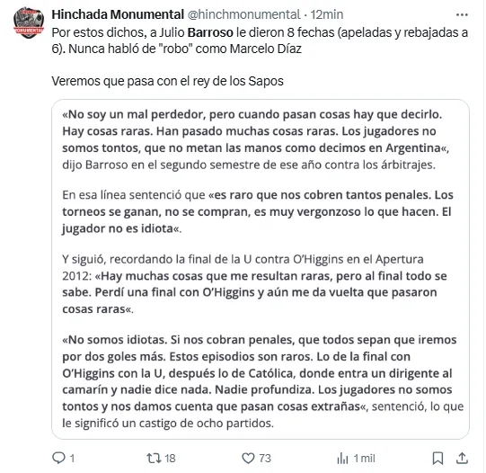 Julio Barroso recibió ocho fechas de sanción de parte del Tribunal de Disciplina de la ANFP por estas palabras. Finalmente tras una apelación del Cacique se logró bajar a seis. ¿Vendrá un castigo similar en esta pasada para Díaz y Universidad de Chile?