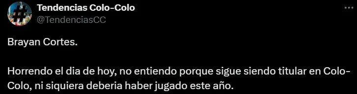 En esa misma línea se sumó la cuenta de X, ‘Tendencias Colo Colo’, quien apuntó a Cortés como uno de los principales responsables de la derrota, señalando: “Brayan Cortés, horrendo el día de hoy, no entiendo por qué sigue siendo titular en Colo-Colo, ni siquiera debería haber jugado este año”.