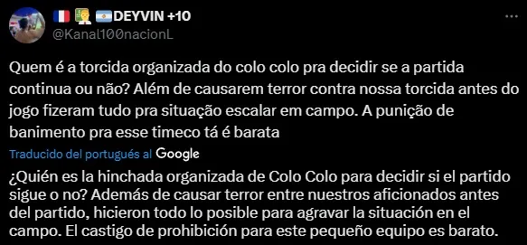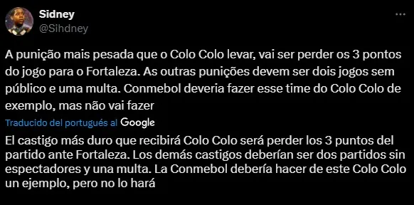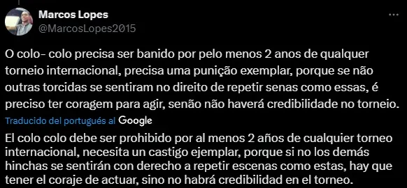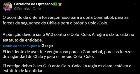 “Colo Colo debería ser expulsado por al menos dos años de cualquier torneo internacional”, escribió un usuario. Otro fue categórico: “¿Pusieron en riesgo al equipo rival? = Eliminación de la competencia”.
