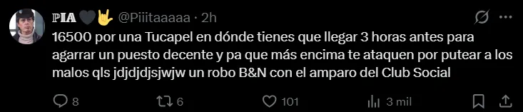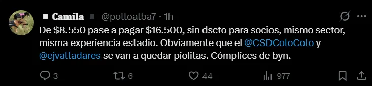 En X, en tanto, la situación no cambió y también se generaron múltiples críticas por el alto valor. Por ejemplo, Camila, alias @Polloalba7, escribió:“De $8.550 pase a pagar $16.500, sin dscto para socios, mismo sector, misma experiencia estadio”.