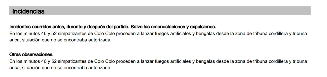 “En los minutos 46’ y 52′, simpatizantes de Colo Colo proceden a lanzar fuegos artificiales y bengalas desde la zona de tribuna Cordillera y tribuna Arica, situación que no se encontraba autorizada“, redactó el árbitro.