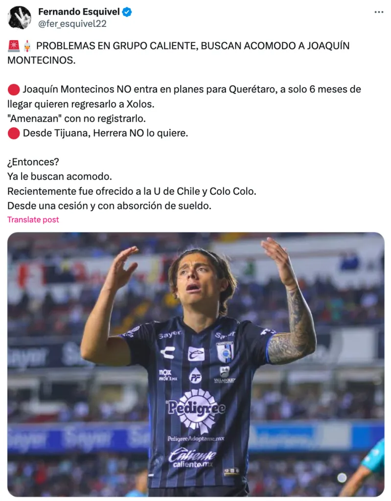 La información de Fernando Esquivel es que Colo Colo fue uno de los equipos donde propusieron el fichaje de Montecinos. Pero no así simplemente, sino que la idea es que Xolos de Tijuana pague parte de su sueldo y lo absorban para no dejarlo seis meses sin jugar.
