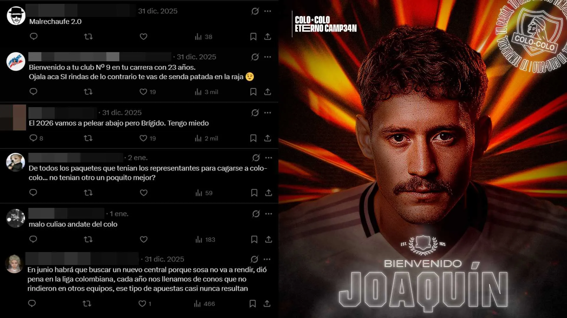 “No llega a 2da rueda, te lo firmo”, “Malrechaufe 2.0” y “De todos los paquetes que tenían los representantes para cagarse a Colo Colo… no tenían otro un poquito mejor?” son solo algunos de los comentarios que hasta hoy se pueden apreciar en los tweets de presentación que Colo Colo le dedicó a Sosa.
