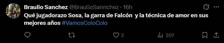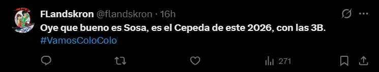 Por ejemplo, podemos encontrarnos con comentarios de Braulio Sánchez, fanático albo que señaló en X: “Qué jugadorazo Sosa, la garra de Falcón y la técnica de Amor en sus mejores años”, o el de Flandskron, quien escribió: “Oye que bueno es Sosa, es el Cepeda de este 2026, con las 3B.”