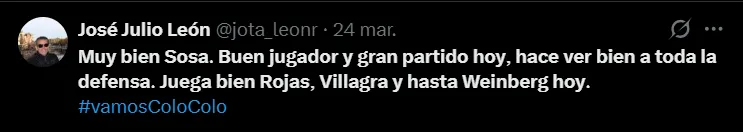 En la misma línea nos encontramos con José Julio León, hincha albo que destacó a Sosa e indicó: “Muy bien Sosa. Buen jugador y gran partido hoy, hace ver bien a toda la defensa. Juega bien Rojas, Villagra y hasta Weinberg hoy”.