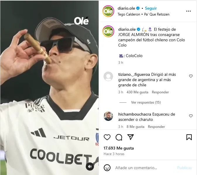 Por su parte, el diario deportivo Olé hizo eco de este clip viral y junto con poner un emoji de cigarrillo y otro de top, destacó la celebración de Jorge Almirón del título de Colo Colo, con la popular canción de Tego Calderón. En efecto, ¡fue cine!