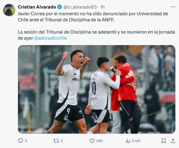 El comunicador indicó que “Javier Correa por el momento no ha sido denunciado por Universidad de Chile ante el Tribunal de Disciplina de la ANFP”, junto con agregar otro detalle: “La sesión del Tribunal de Disciplina se adelantó y se reunieron en la jornada de ayer”, cerró.