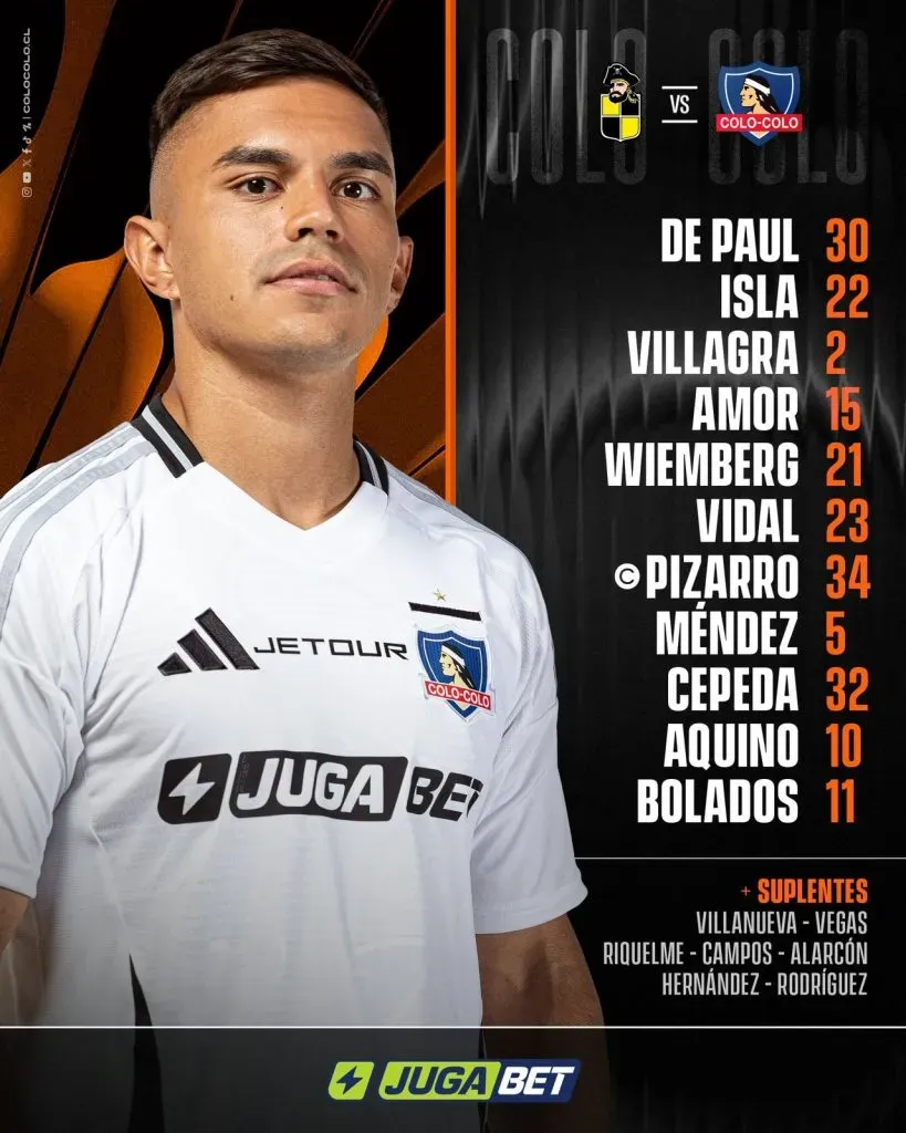 La formación de Colo Colo será con Fernando de Paul en el arco; Mauricio Isla, Jonathan Villagra, Emiliano Amor y Erick Wiemberg en defensa; Arturo Vidal, Vicente Pizarro y Víctor Felipe Méndez en el mediocampo; Lucas Cepeda, Marcos Bolados y Claudio Aquino en delantera.