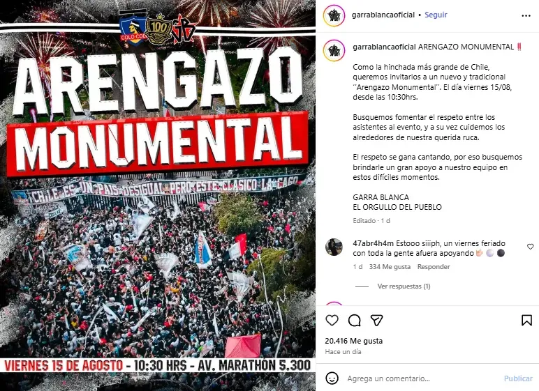 Sin embargo, la Garra Blanca informó que llevarán adelante otro “arengazo” en las afueras del Estadio Monumental para este viernes 15 de agosto a las 10:30 hrs.