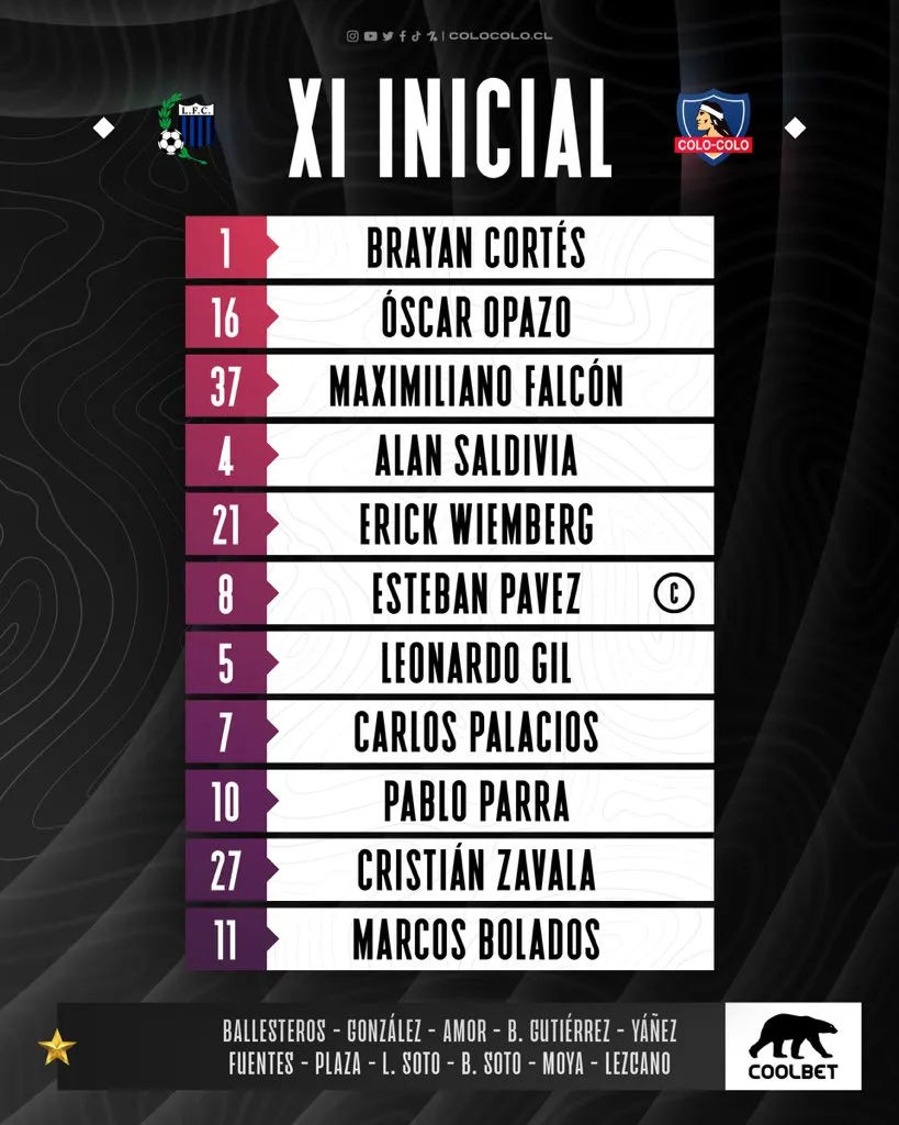 Colo Colo formará con Brayan Cortés en el arco; Óscar Opazo, Alan Saldivia, Maximiliano Falcón y Erick Wiemberg en defensa; Esteban Pavez, Cristián Zavala y Leonardo Gil en el mediocampo; Marcos Bolados, Carlos Palacios y Pablo Parra en delantera.