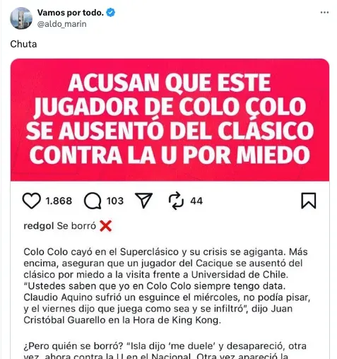 El tema es que hubo otros jugadores como Claudio Aquino, que pese a llegar entre algodones, decidieron arriesgar y disputar el duelo en el Estadio Nacional. Lo que no pasó desapercibido por la reacción del lateral.