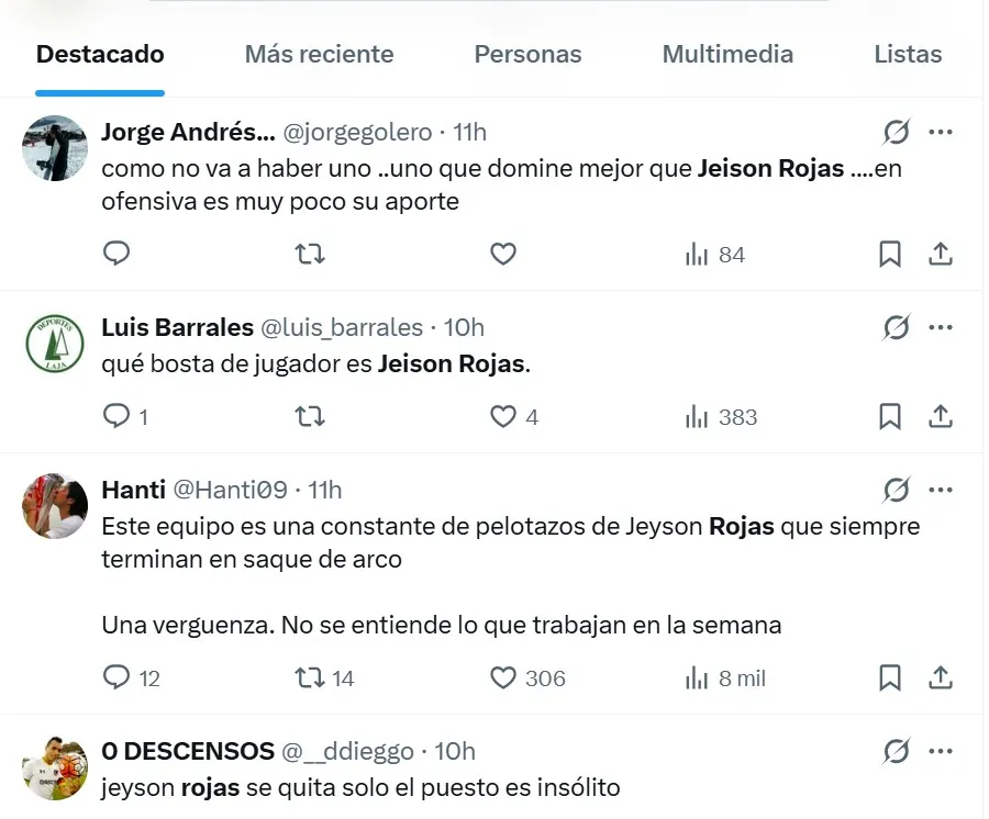 Eso también llevó a que los hinchas criticaran duramente a dos jugadores que poco aportan en materia ofensiva: Jeyson Rojas y Tomás Alarcón.