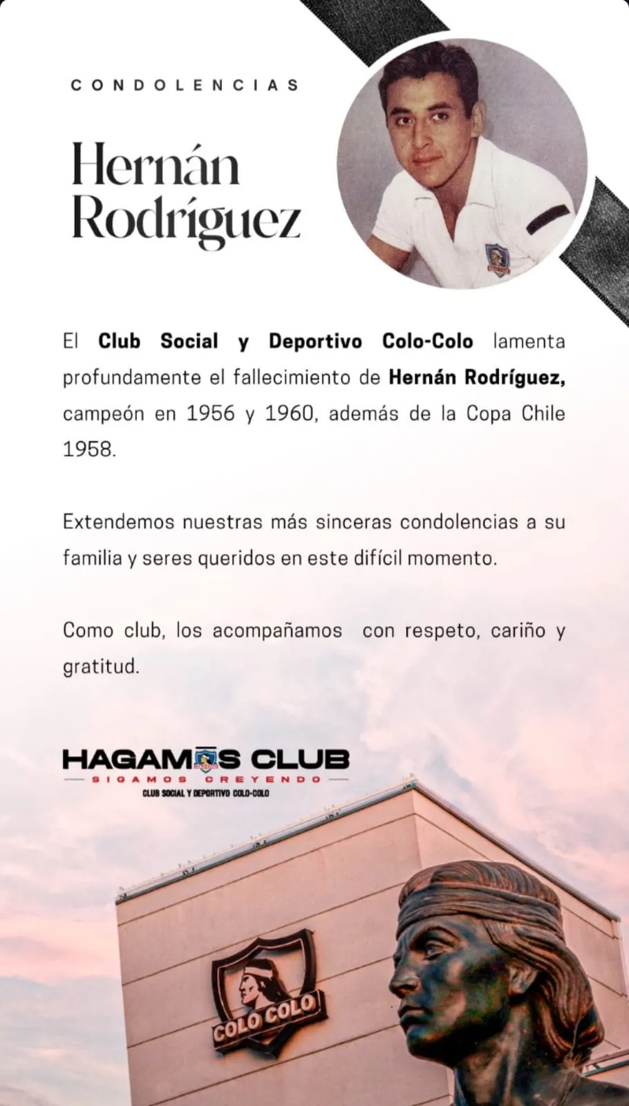 “Colo Colo lamenta profundamente el fallecimiento de Hernán Rodríguez, campeón en 1956 y 1960, además de la Copa Chile 1958. Extendemos neustras más sinceras condolencias a su familia y seres queridos en este difícil momento”, informó el club.