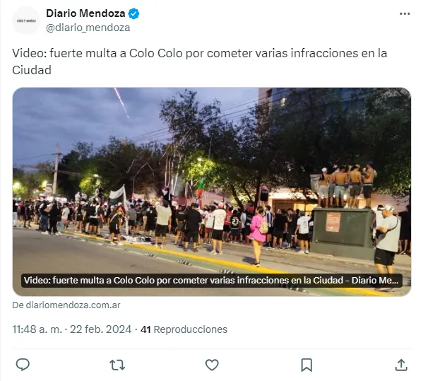 Esto, porque el Intendente de Mendoza, Ulpiano Suárez, comunicó que Colo Colo incurrió en tres faltas gravísimas al Código de Convivencia del Gobierno Provincial, ya que además de lo descrito con anterioridad, cortaron las calles sin autorización policial.