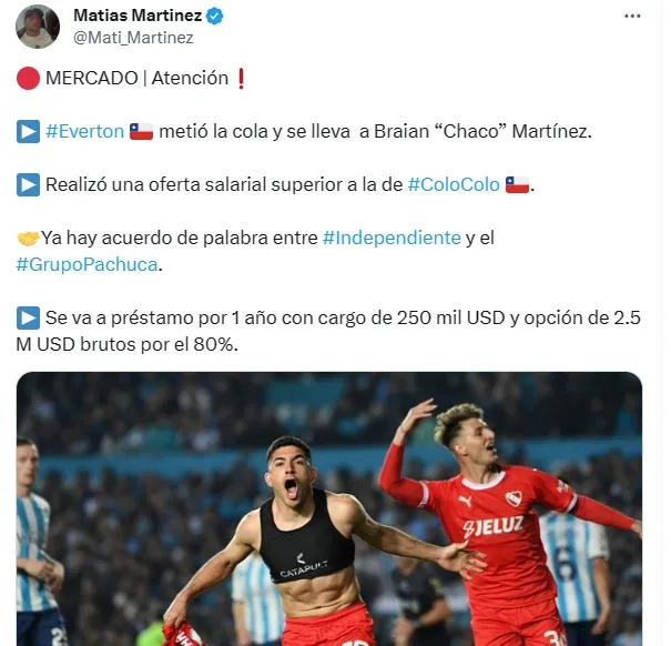 Según informa Martínez en sus redes sociales, Everton, con el auspicio del grupo Pachuca, presentó una mejor propuesta económica que los albos, por lo que Independiente cambió la mira: “Everton metió la cola y se lleva a Braian “Chaco” Martínez”.