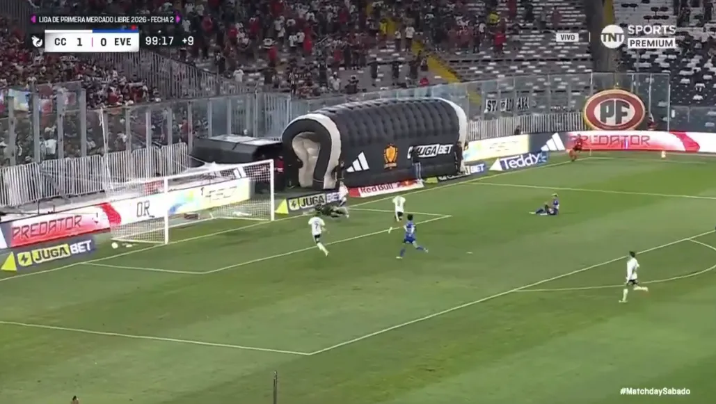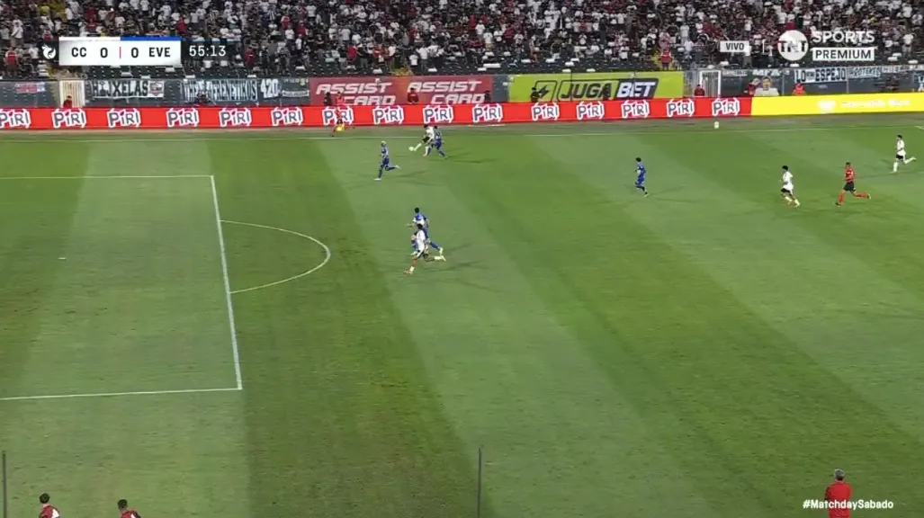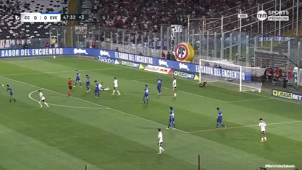 Francisco Marchant desparrama a la defensa de Everton y llega hasta la línea de fondo. Sin embargo, su centro es desviado y Colo Colo no puede marcar el primer tanto. Los hinchas se impacientan en el Monumental.