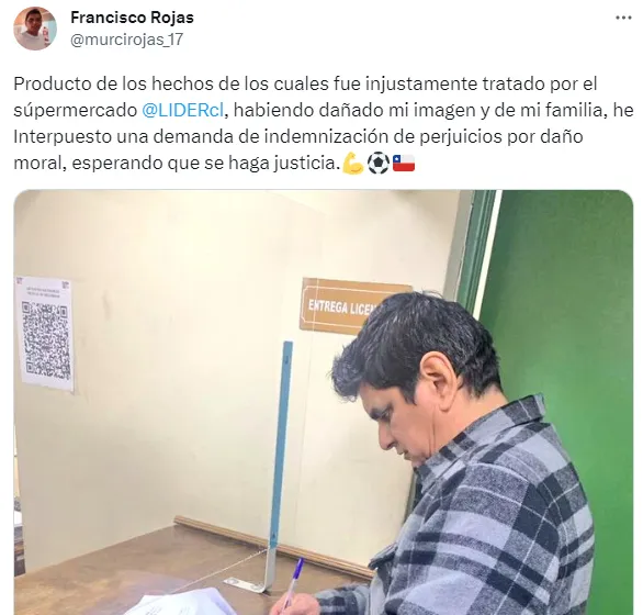 “Producto de los hechos de los cuales fue injustamente tratado por el supermercado Líder, habiendo dañado mi imagen y la de mi familia, he interpuesto una demanda de indemnización de perjuicios por daño moral, esperando que se haga justicia”, publicó el Murci en su cuenta de Twitter.