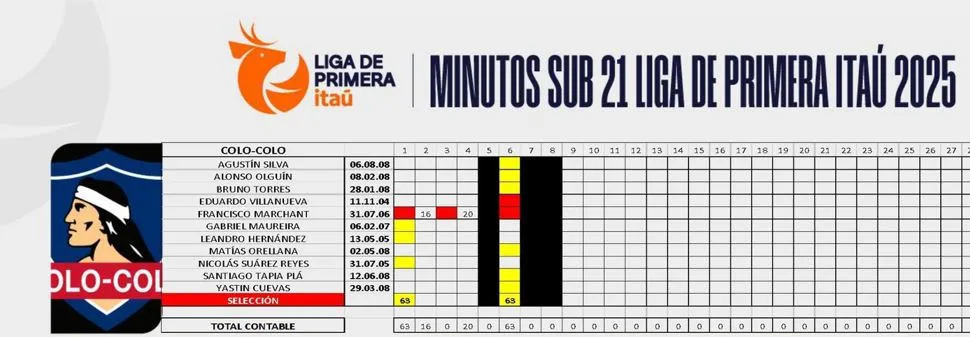 Con ocho fechas jugadas (un duelo suspendido ante D. Iquique), Colo Colo es el equipo que menos minutos Sub 21 ha sumado. Es más la cifra está muy por debajo de lo común y si no fuera por los minutos que sumó la Roja juvenil, sería peor.