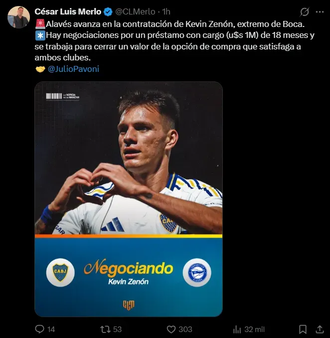 “🚨Alavés avanza en la contratación de Kevin Zenón, extremo de Boca”, señaló Merlo en primera instancia, para luego detallar las condiciones de la negociación: “Hay negociaciones por un préstamo con cargo (US$ 1 millón) de 18 meses y se trabaja para cerrar un valor de la opción de compra que satisfaga a ambos clubes”.