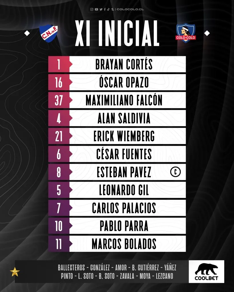 Así las cosas, Colo Colo salta a la cancha para enfrentar a Nacional con este 11 titular: Brayan Cortés en el arco; Óscar Opazo, Maximiliano Falcón, Alan Saldivia y Erick Wiemberg en la defensa; Esteban Pavez, César Fuentes y Leonardo Gil en el mediocampo; Carlos Palacios, Marcos Bolados y Pablo Parra en ataque.