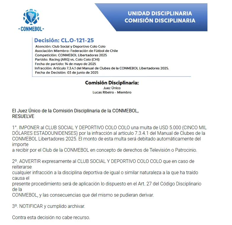 Sin embargo, lo más preocupante vino después. Si se repite el hecho, la Conmebol advierte que Colo Colo puede ser nuevamente sancionado ya sea con una nueva cifra, o bien con la pérdida del partido por 3-0, de acuerdo al artículo 27 del Código Disciplinario.