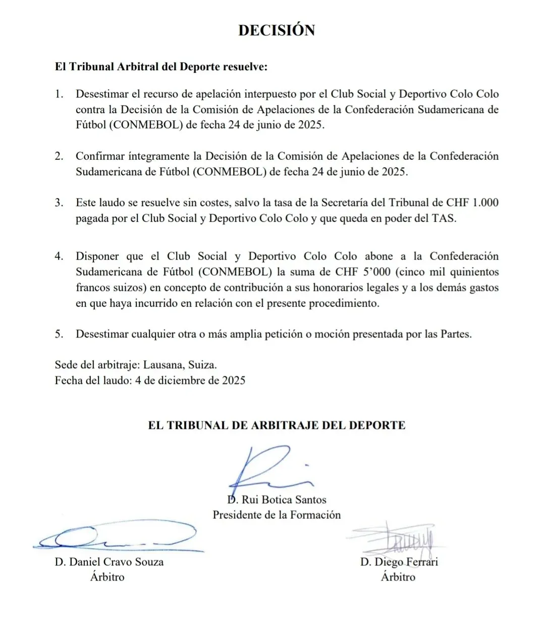 - Desestimar el recurso de apelación interpuesto por el Club Social y Deportivo Colo Colo contra la Decisión de la Comisión de Apelaciones de la Conmebol de fecha 24 de junio del 2025.