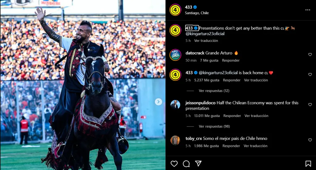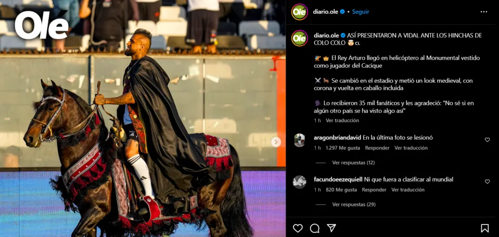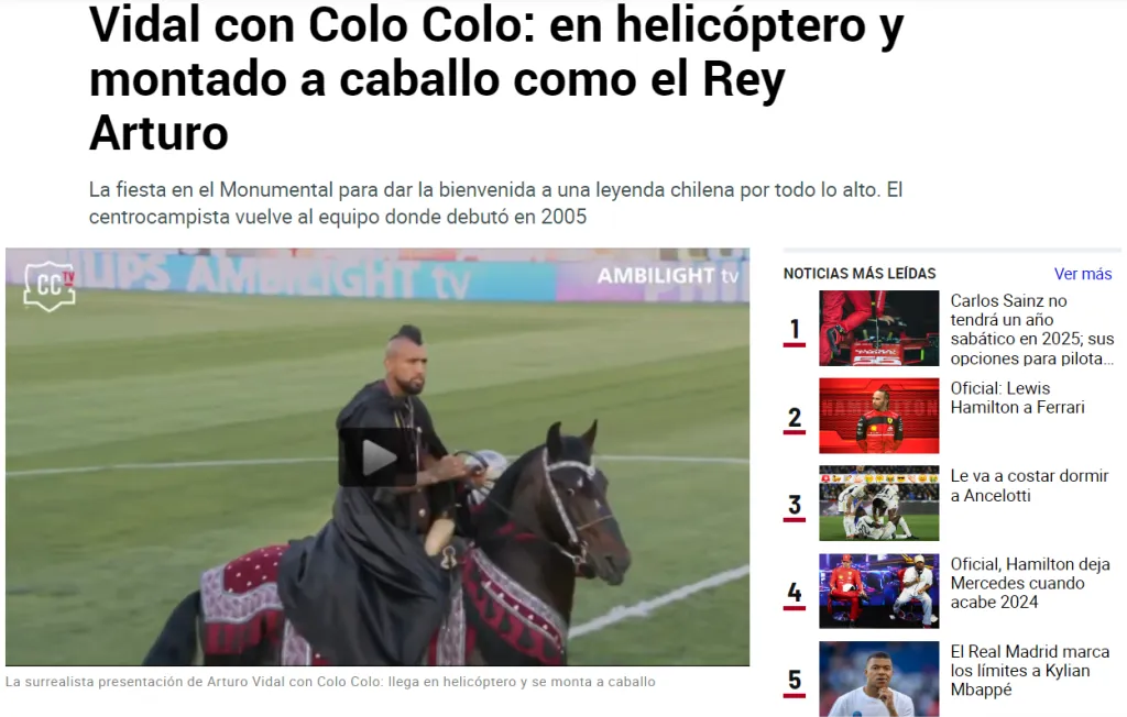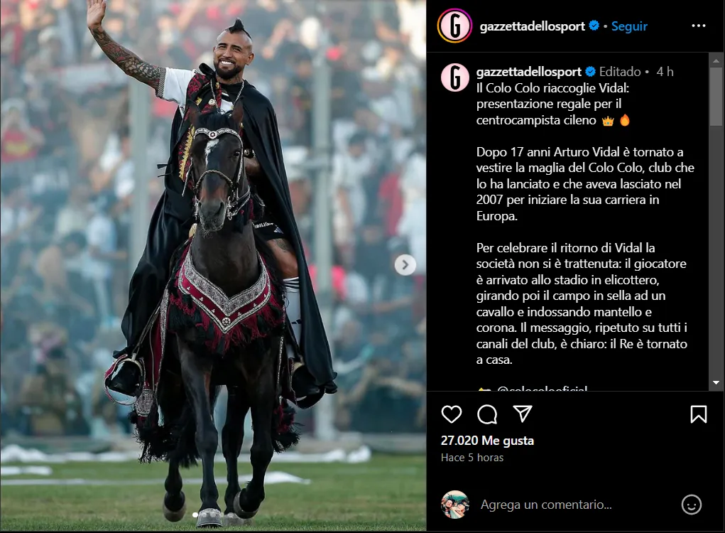 The Guardian, clásico medio de Gran Bretaña, dice que “Arturo Vidal llegó a su inauguración en Colo Colo en un helicóptero, antes de montar a caballo vestido de rey, portando una corona y sosteniendo una espada mientras recorría la cancha, mientras saludaba a aproximadamente 35.000 fanáticos en Santiago, en su regreso al club después de 17 años”.