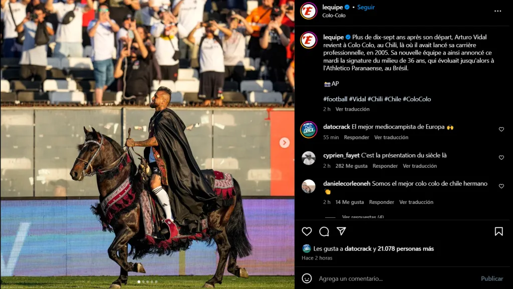 El presigioso L’Equipe indica que “más de diecisiete años después de su partida, Arturo Vidal regresa a Colo Colo, en Chile, donde había lanzado su carrera profesional, en 2005. Su nuevo equipo anunció el martes el fichaje del centrocampista de 36 años, que se desarrollaba hasta entonces en el Athletico Paranaense de Brasil”.