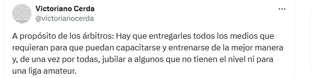 “A propósito de los árbitros: Hay que entregarles todos los medios que requieran para que puedan capacitarse y entrenarse de la mejor manera y, de una vez por todas, jubilar a algunos que no tienen el nivel ni para una liga amateur“, comentó Cerda.
